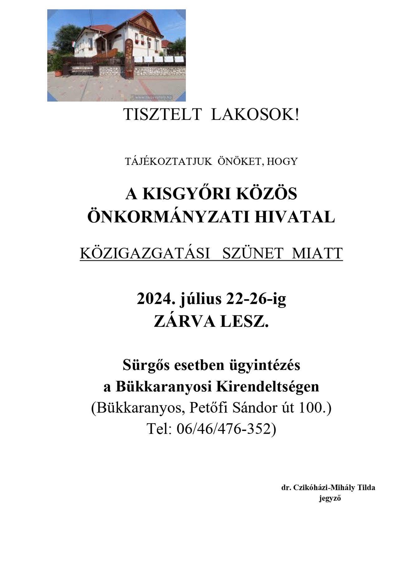 Tájékoztatjuk a lakosságot, hogy 2024.07.22 és 2024.07.26. között a Kisgyőri Közös Önkormányzati Hivatalban igazgatási szünet lesz.Ez idő alatt a hivatal zárva lesz. Feltöltések Igazgatasi_szunet_2024.pdf
