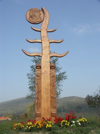 Falukapunk 7 m magas, tölgyfából készült, középen egy életfa, tetejében egy napkorong, amelyen a rozetta fölfelé forog. Ez azt mutatja, hogy ez a település mindig élni fog. 7 ága a magyarságunkra utal, a két oldalán lévő kisgyőri kalapos kapuoszlop pedig fogadja a hazaérkezőt, illetve az idelátogatót. A két kapuoszlopon látható motívumok Szabó Ida 1930-as gyűjtése alapján készültek el.