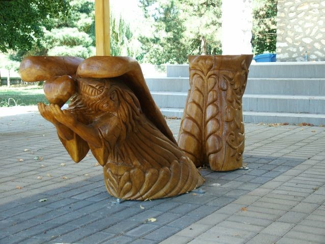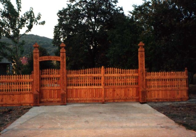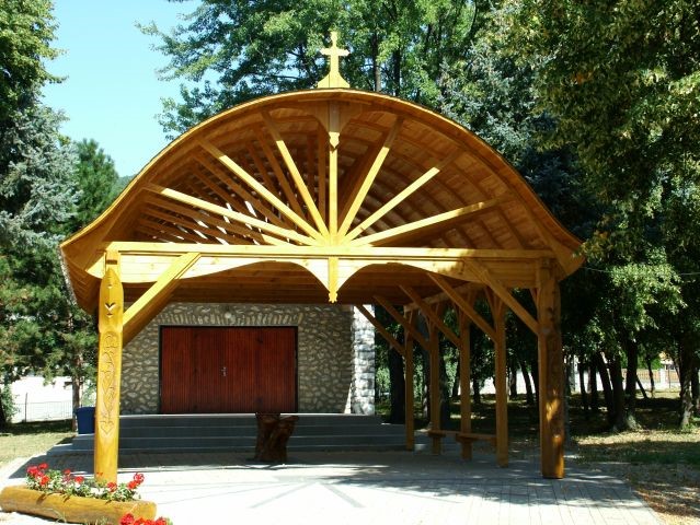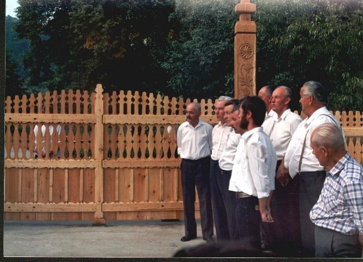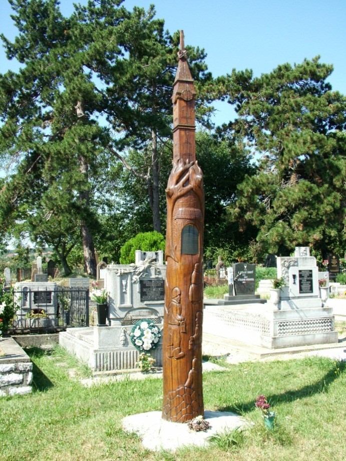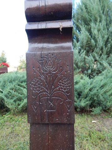Temetőkapu; családi táborunk legelső alkotása, 1990-ben készült. A kapu méreteit, mintáját még a ’80-as években fellelhető, jó gazda Bihari Sándor bácsi kapujáról mintáztuk. A díszítésében még kezdeti hibákat fedezhetünk fel pl. az oszlopfőn látható tulipános minták hajlásában. Ez a munka első kísérletünk volt, amikor a teljes 3 m-es oszlopot kifúrtuk, hogy a geszt rész kikerüljön, ezáltal megakadályozzuk az oszlop repedését.