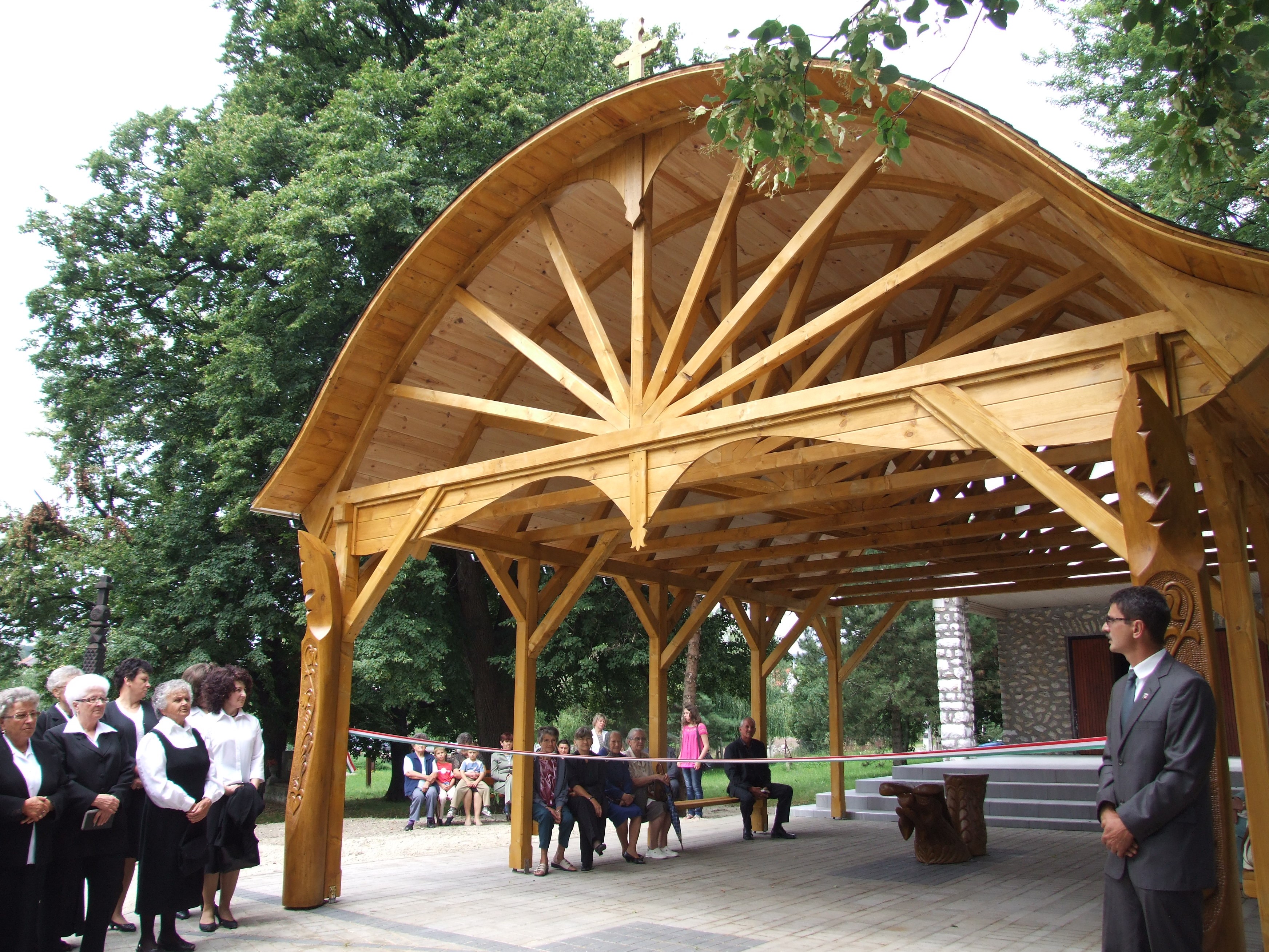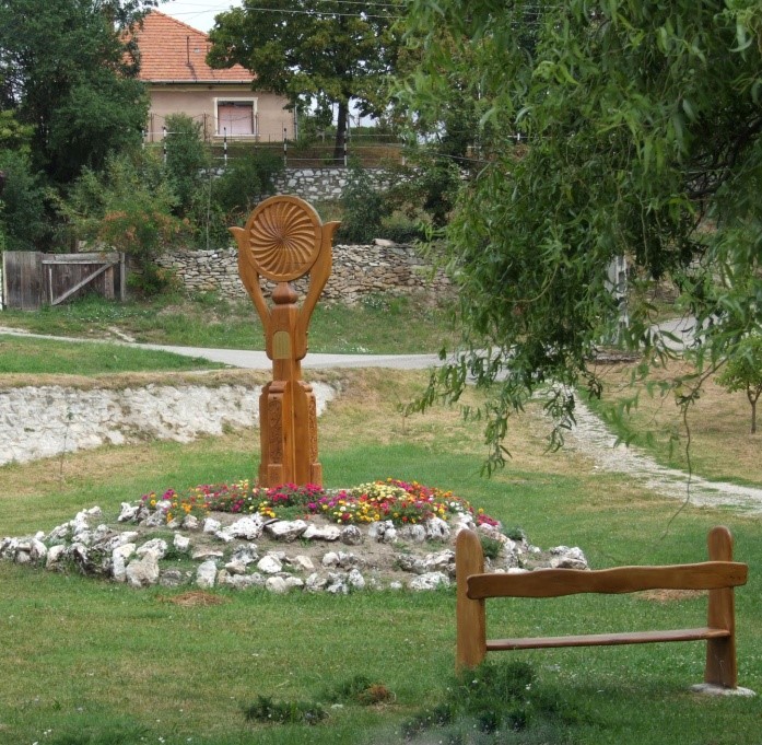 A következő alkotás a kegyeleti helyünk, amelynek tetőszerkezete egy lehajló tulipán. Ez a motívum   utal az elmúlásra. Előtte két szatmárcsekei fejfa áll, a két meghajló törzs pedig búcsúzás az elhunyt előtt.