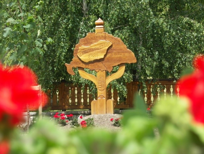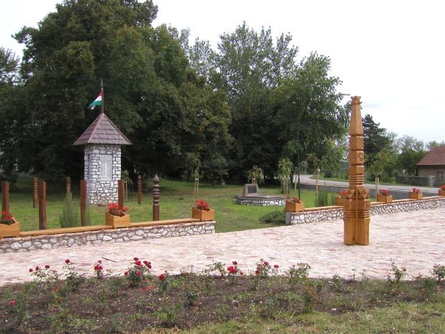 Egy szokványos emlékmű volt, egy obeliszk oszlop, melynek a tetejére egy bombát helyeztek. Szerintem a bomba nem az emlékezés, hanem a rombolás jelképe. Ezen obeliszk tetejéről lekerült a bomba, helyére zsindelyes tetőt készítettünk, amely kapott egy őrfát. Erre tettünk egy nemzeti színű zászlót. Az oszlop köré az a 13 fejfa került, amelyeket még 1980-ban rajzoltam le a kisgyőri temetőben. Ezek  mára eltűntek a temetőből, viszont itt megmaradtak, hogy emlékeztessenek bennünket a kisgyőri hagyományos fejfákra. Ezek a fejfák úgy vannak elhelyezve a térben, hogy a zászló árnyéka reggel 6-tól este 6-ig mint egy napóra mutassa az időt, de itt az egésznek nem a napóra funkció a lényege, hanem  az, hogy az a vészterhes idő, amely akkor érte a magyarságot, még egyszer ne következzen be.