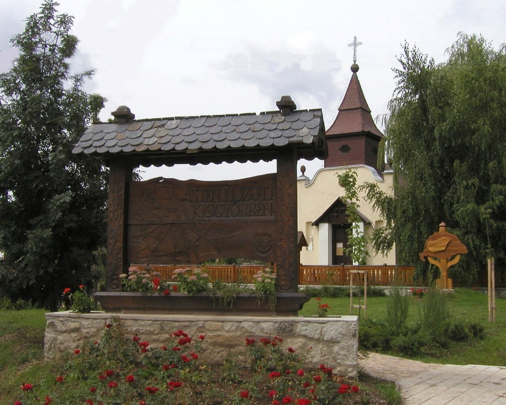 A köszöntőtábla elkészítésének is megvan a maga érdekessége. Kisgyőrben található egy természetes palabánya, melyből a lillafüredi Palota Szállót, illetve a szájhagyomány szerint, a világháború után az Országházat is fedték. A mögötte lévő kápolnát még természetes palával borították, így egyértelmű volt számunkra, hogy ezt a köszöntőtáblát is palával ékesítjük. Kimentünk a bányába, hozzákezdtünk a palák faragásához, de mindegyik darabokra hullott. Ezután támadt az a gondolatom, hogy felkeresem azt a személyt, aki még dolgozott ebben a bányában. Csenge Lajos bácsitól, településünk egyik legidősebb tagjától a következő bölcsességet tanultam. „Drága Lacikám, a Jóisten azért teremtette oda azt a forrást, hogy áztasd be a palát, majd utána csak egyszerűen vágd le lemezollóval!