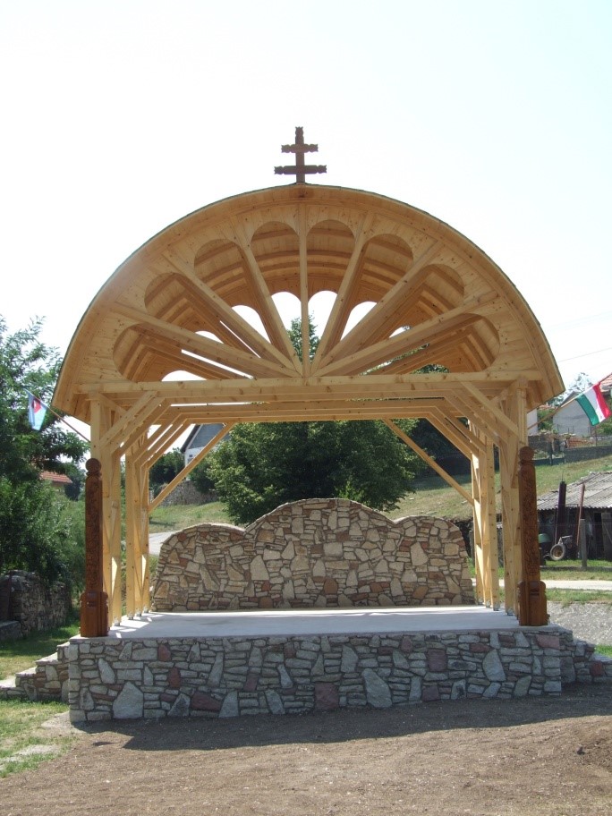 A falu központjában található színpad tetőszerkezete a napot, az életet szimbolizálja. Oldalán két, kisgyőri motívumokra épülő oszlopfő található. A színpad háttere pedig a hármas halommal, kettős kereszttel utal magyarságunkra.