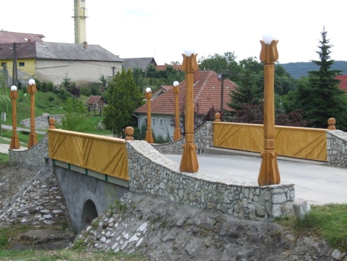 Kisgyőr arculatához nem illett volna egy vaskandeláberes híd. Az ötlet pedig Bánszky Pali bácsi könyvcíméről jutott eszembe „ A megújuló faragó hagyomány”. A Bükkalján használatos motívumok felhasználásával olyan kandelábereket készítettünk el, amelyek egyben tükrözik a hagyományt és a jelent, mivel tetején megújuló energiával működő lámpák világítanak. A díszítőelemeiben a Nap, a víz és az életfa jelenik meg.