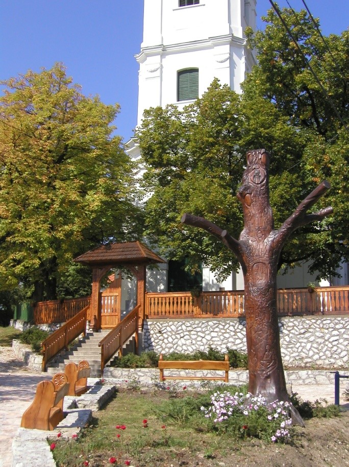 A református templom kötött, fedeles kapujának oszlopfőjére nem a szokványos életfa motívumok kerültek, hanem Mária Terézia idejében, a templom belsejében készült festett életfa motívumokat használtuk fel.