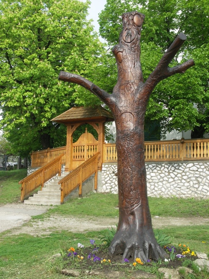 A tölgyfa belsejébe kerültek a Bükkalján használatos tulipános minták. Az egyik oldalán, mint egy életfa, bimbóban végződik, a másik oldalát pedig lehajló tulipánok díszítik, tetején fejfamotívummal. Miért is lett ilyen ez az alkotás? Dr. Gyökössy Endre boldog mondásai hívták rá fel a figyelmemet, hogy ezt üzenetként el kell készítenem a jövő nemzedék számára. „Boldogok, akik észreveszik egy diófában a bölcsőt, az asztalt és a koporsót, és mindháromban a diófát, mert nem csak néznek, hanem látnak is.”
